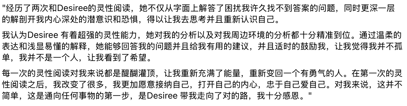 I had two great intuitive reading sessions with Desiree, she not only answered my question which bothered me a lot, but also in a way dissected into the deepest part of my heart and soul, and subsequently lead me to the process of self-discovery by thinking more deeply.